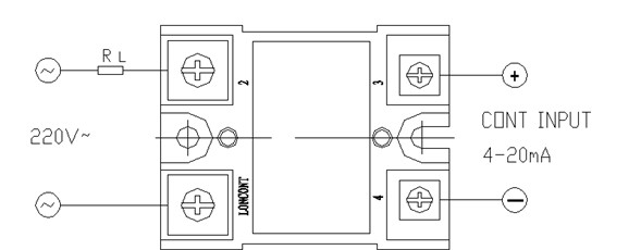 調(diào)壓器內(nèi)部①②端為可控硅電路,分為雙向可控硅普通型、單相可控硅反并增強(qiáng)型和單相可控硅半波型。其中半波型只對(duì)交流電壓的正半周調(diào)壓(模塊內(nèi)部單向可控硅的陽(yáng)極接①端,陰極接②端)。③④端為4-20mA控制輸入,③端接正極,④端接負(fù)極,可以與溫控表或PLC等的4-20mA輸出控制端口匹配。調(diào)壓器輸出電壓隨著控制信號(hào)的強(qiáng)弱而線性變化。