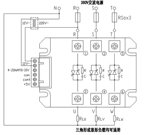 3、模塊適用于電加熱等阻性負載,負載Δ形或Y形接法均可,Y形接法時負載中心點必須接入N線。
