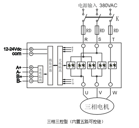 4、模塊內(nèi)置輸入保護(hù)電路,在380Vac強(qiáng)電未接入的情況下,即使輸入端有控制信號(hào)也不會(huì)觸發(fā)可控硅導(dǎo)通。只有在主電路上電完成后,輸入端才正式開始接受控制信號(hào)的指令。