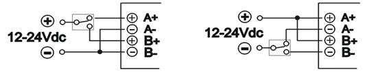 7、輸入控制電壓為12-24Vdc,共陽或共陰可任意接線。控制線共陽連接時,A—、B—端低電平有效,當A—、B—端同時為低電平時模塊自動關(guān)閉。共陰連接時,A+、B+端高電平有效,當A+、B+端同時為高電平時模塊自動關(guān)閉。其他控制電壓也可定制。
